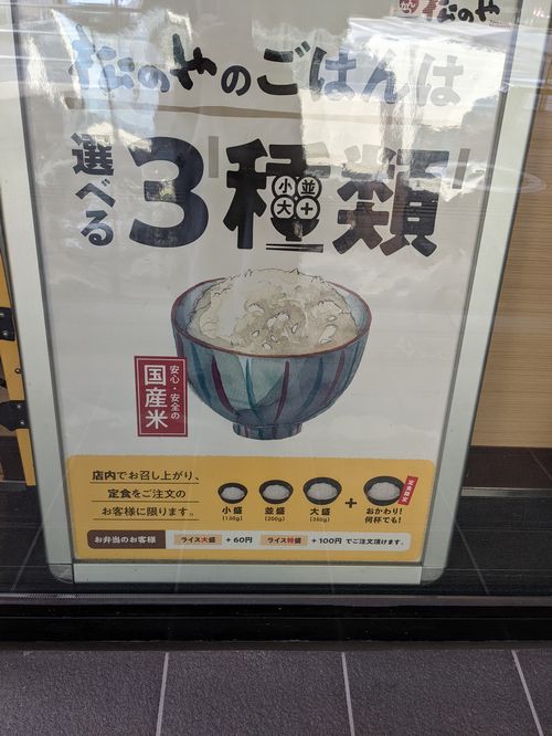 最近外食の際のお米の量が結構気になるので、こうやって分量を出しているお店をみるとついついチェックしてしまう。松のやの場合、小盛130グラム、並盛200グラム、大盛350グラム、だそうです。ちなみにうちは、1膳100グラム。