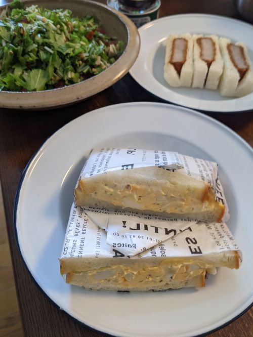 無事に歯科検診を終えて、駅ビルで玉子サンドとまい泉のヒレカツサンドを買って帰宅。それと水菜の刻みサラダでお昼。