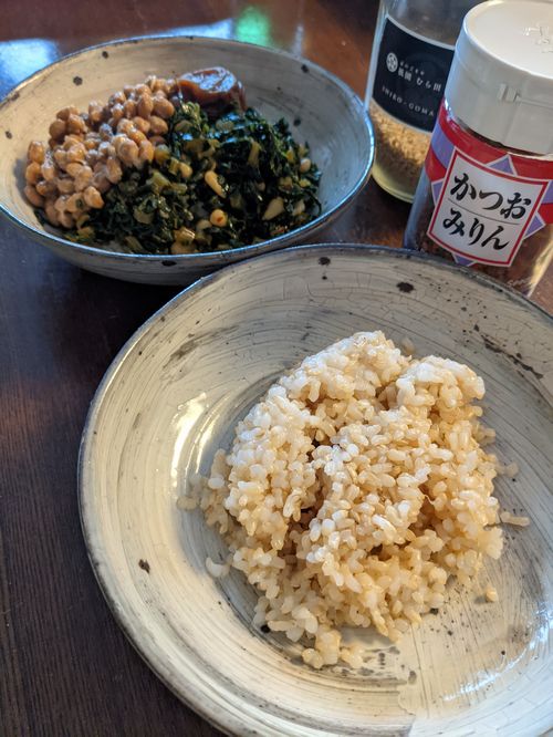 大根葉炒め ごっつい葉っぱ付きの大きな大根を買ったので、葉だけ先に切り落として刻んで松の実と一緒にしょうゆ炒めにしていた。今朝はそれをご飯にたっぷりのせて食べる。あと、納豆と梅干しもオン。 夫はふりかけで。めんどくさいので玉子はなし。 作成者: yudeta 東京在住、40代主婦の備忘録を兼ねた食事日記です。書籍のリンクにのみ、アマゾンアフィリエイトを入れています。ご了承ください。 yudetaのすべての投稿を表示。