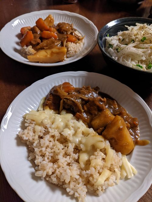 夫には、冷凍庫にあった溶けるチーズを振りかけて、チーズカレーに。大根とほたて缶詰のマヨネーズサラダ。