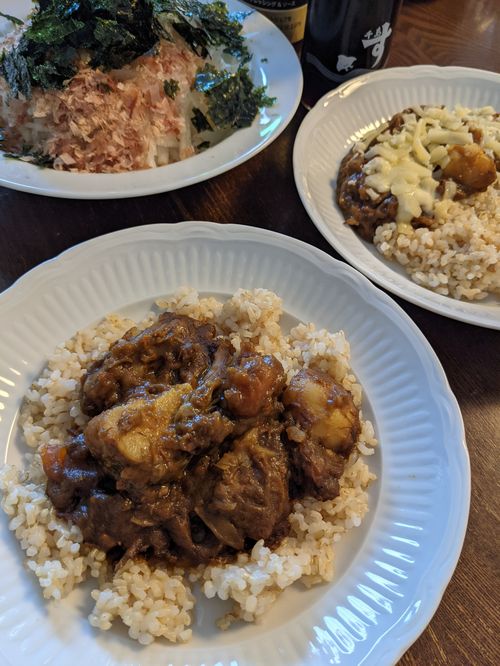 ジャワカレープライムは、ルーが粉末タイプで、1袋2皿分に個包装されたものが1箱に4袋入っている。今回は2袋使ったので、本来なら昨日で食べ切れているはずなんだけど、やっぱりあと少し残ってしまう。鍋の周りのルーもへつって2人分捻出して、最後のカレー。大根サラダは、昨日と同じく、韓国海苔、かつおぶし、白ごま、オリーブオイルとポン酢のドレッシング。