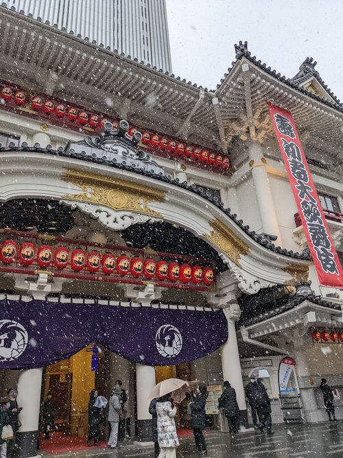 この日が私の初芝居でしたが、あいにくの雪。壽初春大歌舞伎の1部を観るために歌舞伎座に着いたときにはもうちらちら降っていましたが、終わって出たときにはこんな感じに本降り。月に数回しか都心に出ないのについてない。