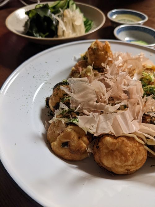 たこ焼きだけもアレかと思って、きゅうりとわかめのらっきょう酢和え。試しに「たこ焼き 副菜」で検索したら、「たこパの献立」を紹介するサイトが山ほど出てきたので、そうか、たこ焼きってホムパメニューの定番なんだと初めて知った。