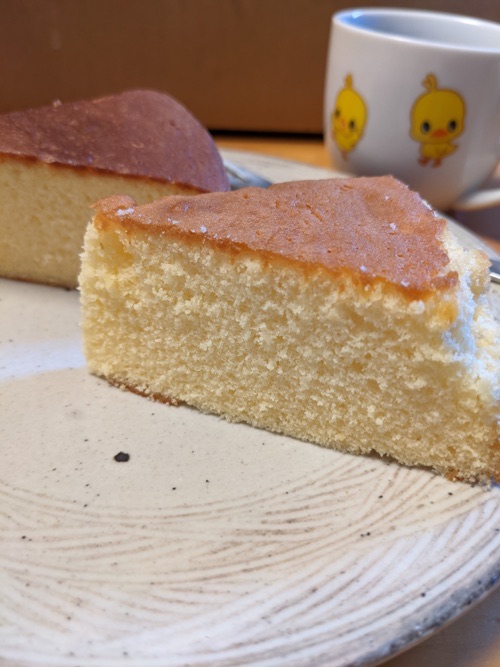 切り分けた時に真っ先に気泡が大きいなと思ったが、実際に食べてみてもパサっとモロっとしており、お手本のしっとりさ加減には程遠い。今度は湯煎せずに泡立ててみようと思う。
