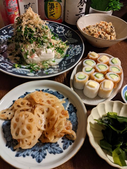 あとは、ちくきゅう、チーちくに、れんこんの梅和え。適当に作った梅だれが無性においしかった。生わかめに、卯の花。
