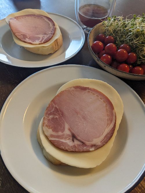 一段落して、夫は「昼いらん」と言っていたけど、2枚入りのパン(白神こだま酵母 サラのてづくりパン 白神ソフトフランス)を買っていたので1枚ずつハムとチーズをのっけて食べた。夫の嫌いな、賞味期限切れの乾燥気味のパンだったけど、文句も言わずに食べていた。