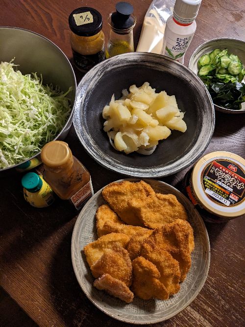 久しぶりの家ご飯だし、夫の好物を作ろうと、チキンカツとキャベツの千切り。うかつにもレモンを買い忘れたが、ポッカレモンで事なきを得た。