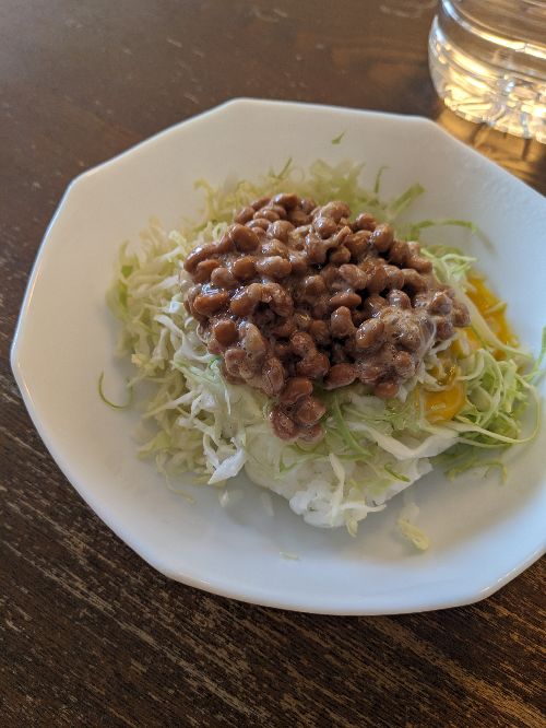 朝散歩して、朝食はそれぞれで用意して食べる。私は、ご飯に、生卵、キャベツの千切り、納豆のっけ。夫は、スキムミルクにオートミールとレーズンを入れて食べていた。