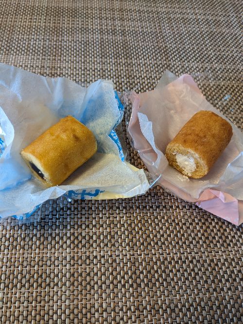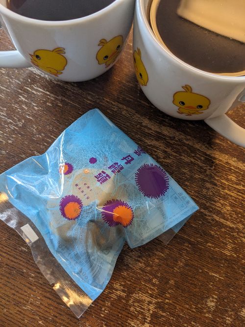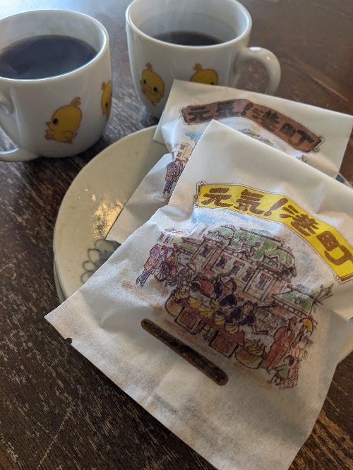 食後に、賞味期限が迫っていた、門司港の菓子せのおの「元気!港町」を食べる。白あんと普通のあんのどらやきです。ここのお菓子は、どれもパッケージがとても可愛いのだけど、これには門司港駅前のバナナの叩き売りの様子がイラストで描かれています。