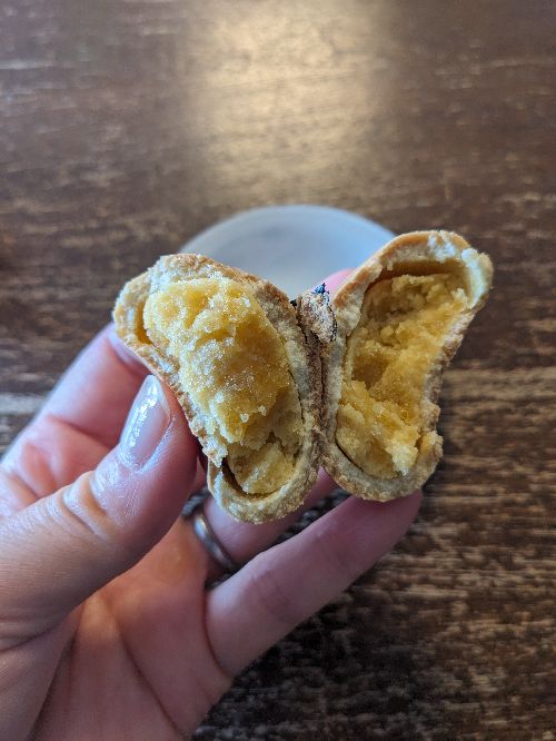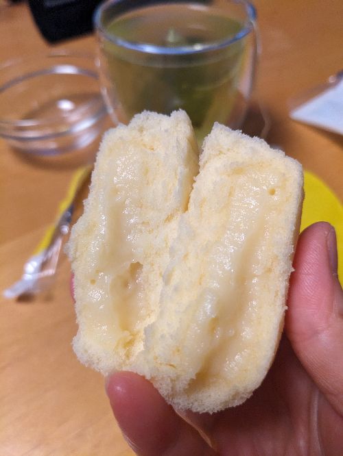 割ったところ。皮はすごく似ていて、甘さ控えめでふんわり。萩の月よりあっさりしている。中身は全然違って、いわゆるフラワーペーストベースのカスタード。クリームパンって感じ。これはこれでおいしい。
