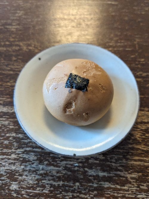 飾りに海苔ってところが、アバンギャルド。皮はいわゆる「ひよ子」の皮みたいなやつ。栗饅頭の皮っていってもいいかも。あの皮って、正式名称はなんて言うんでしょうね。どう検索していいか、よくわからん。