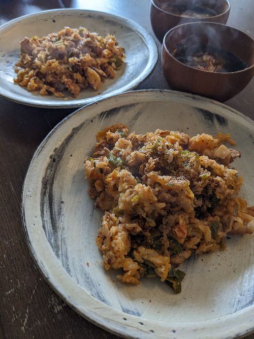 キムチ、ねぎ、玉子、豚バラしゃぶしゃぶ切り落としでチャーハンを作る。最後に濃口しょう油を少々。キムチの汁気が多くて少ししっとり焼きめし風情になったけど、夫大喜びで食べてたので良かった。実際、食感はともかく、味はかなりおいしかった。キムチは偉大。
