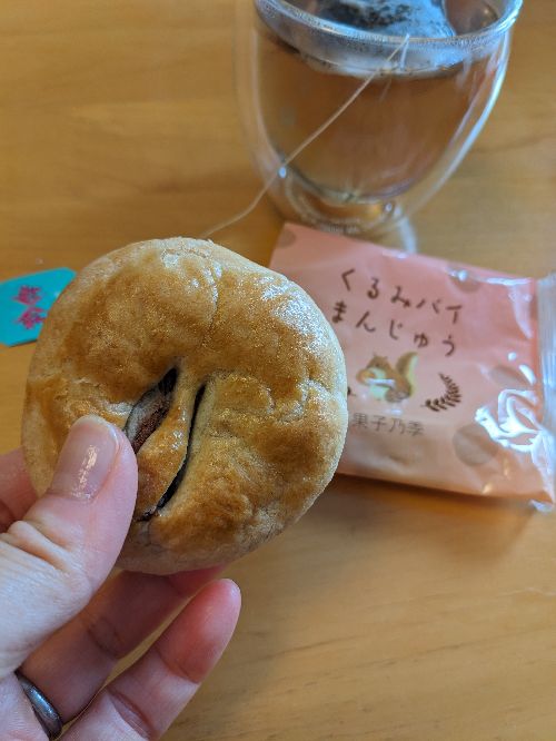 食後に、果子乃季の「くるみパイまんじゅう」。パイ饅頭に目がなくて、やはり出先で買ってしまう。一番好きなのは、三万石の「エキソンパイ」だけど、パイ+あんこの組み合わせは至高で、なんだってどれもおいしいよ。このパイは練り込みパイっぽい感じで、脂っ気の少ない感じ。餡はこしあん、刻んだくるみが少々。全体的にあっさり軽い味わい。