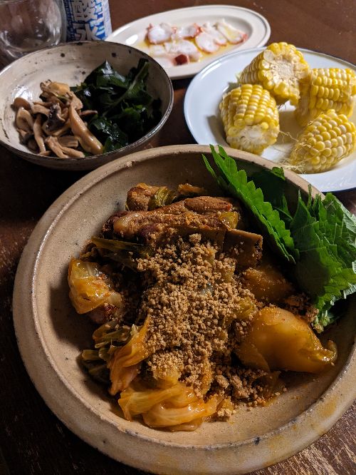 私用に買ってきたお刺身わかめにもポン酢をかけたので、ポン酢が被ってしまって、さらに決まらない献立になった。ただ、私はえごまの葉のしょうゆ漬けがあるので、それでご飯を食べた。結果的に、これだけあったら十分だったじゃないかという感じだけど、でも、きのこは体にいいはずなので、それを摂取できたのはよかった、ということにしたい。
