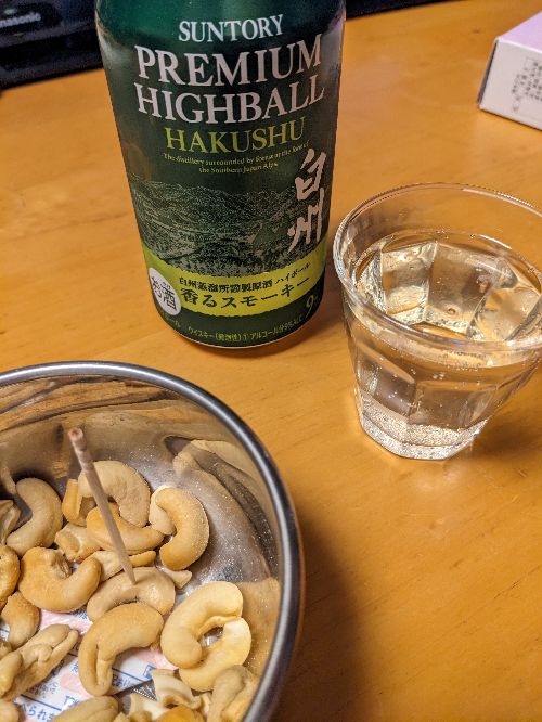 たまたま買えた白州ハイボールで食後の晩酌。1本700円と缶入りハイボールの価格としては破格だけど、詳しい人によると、アルコール度数から換算すると妥当な価格らしい。お供はカシューナッツ。洋酒が苦手な私でもおいしいと感じる。でも、普段飲み付けないから、ありがたみが薄いのがちょっと残念。