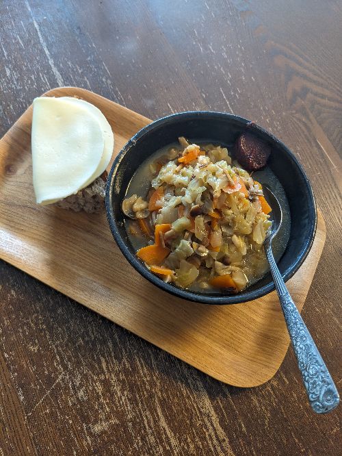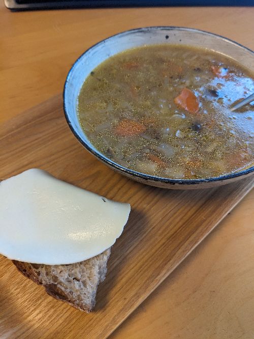 ほぼ汁になった野菜スープと、パンストックのパンとブリースライス。