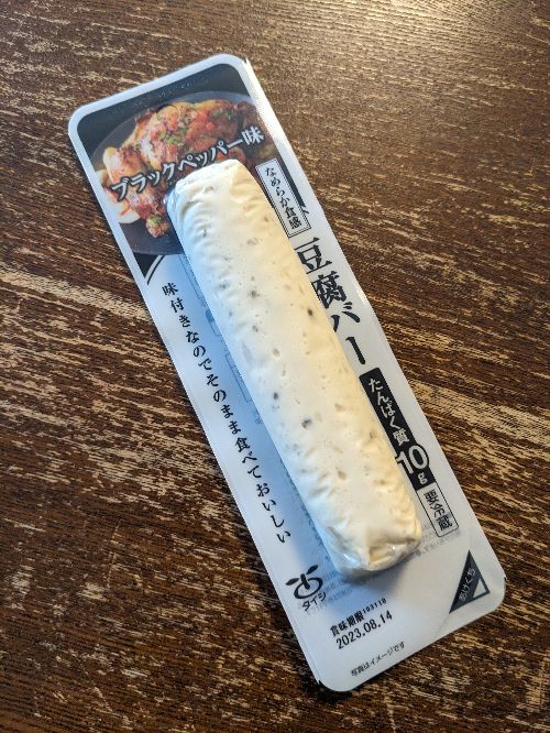 17時頃にお腹が減って、タイシの豆腐バー。ブラックペッパー味。アサヒコと比べて食感が滑らかでびっくりする。でも、個人的には、アサヒコのもすもす食感が好きかな。