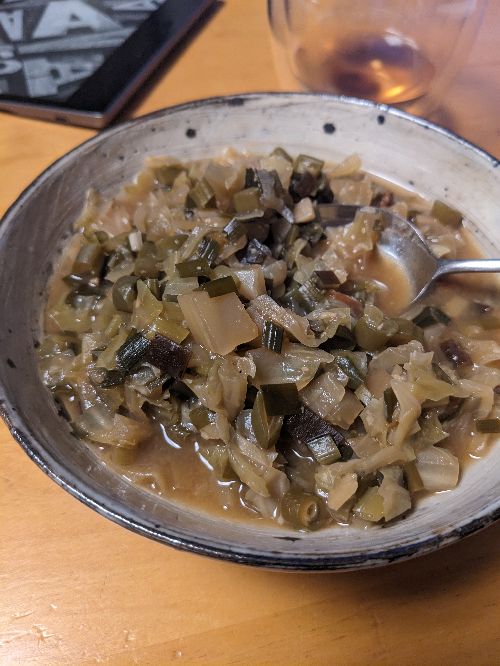 にんじん(小)1本、玉ねぎ(大)1/2、きゃべつ1/2、ブラウンえのき1袋、しめじ1袋、を細かく刻み、少量の油で蒸らし炒めしてかさを減らしてから鶏皮スープを注いで、カセットコンロのとろ火で1時間ほど煮込んだ。とろ火でゆっくり煮ないとこんな感じに柔らかくはならないだろうなと思った。