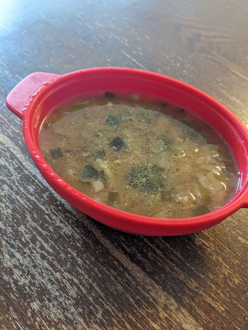 あんまり食欲ないなーと思ってスキムミルク100ccだけで済まそうと思ったら、飲んだら食欲が出たので、残りのスープをレンジでチンして食べる。