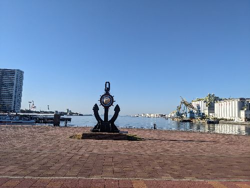 駅を出てすぐ海。すごくキレイなのに、想像以上に人気がなくてびっくりする。ただ、こんなに海が近いんだなぁという点では、妙に感動した。食品会社の冷凍倉庫がたくさんあるのが印象的だった。
