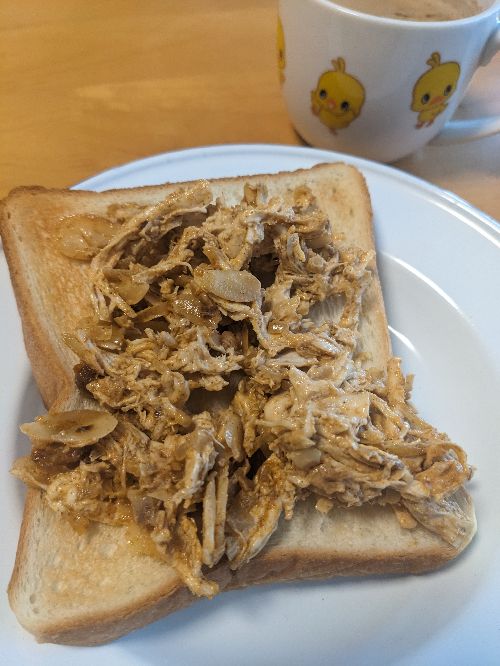 残った超熟を焼いて、残ったコロネーションチキンを乗っけて食べる。お供はカフェオレ。今日の超熟は私専用に買ってきているので、好きなように食べている。