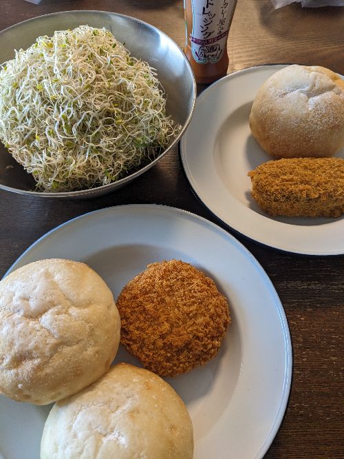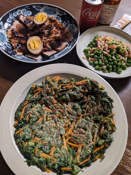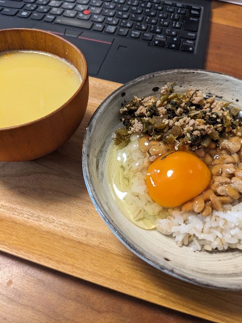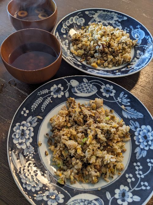 高菜炒めは、銀座熊本館で買ってきた、塩だけで乳酸発酵させたホントの高菜漬けで、かなり酸味があったので、挽肉と一緒に炒めて醤油で味付けしてある。