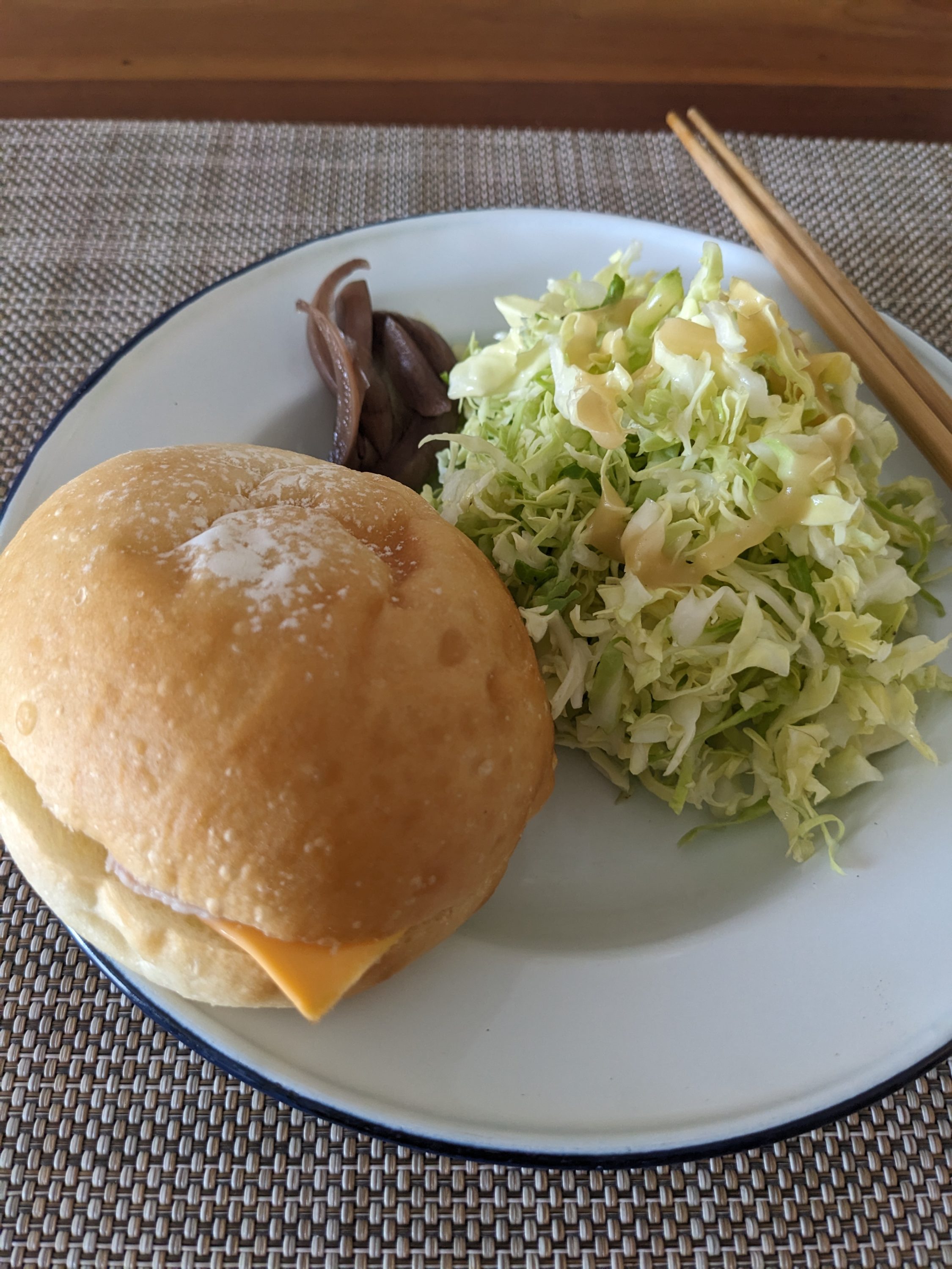 王様のロールパンにハムとチーズを挟んだサンドイッチ。昼過ぎに出る夫用に、朝にあらかじめ2個作って置いておいて、私の分も作っていたので、座って食べるだけ。らくちん。って、ただ単に、先に自分で作っていただけなんだけど、なんとなく得した気分はある。