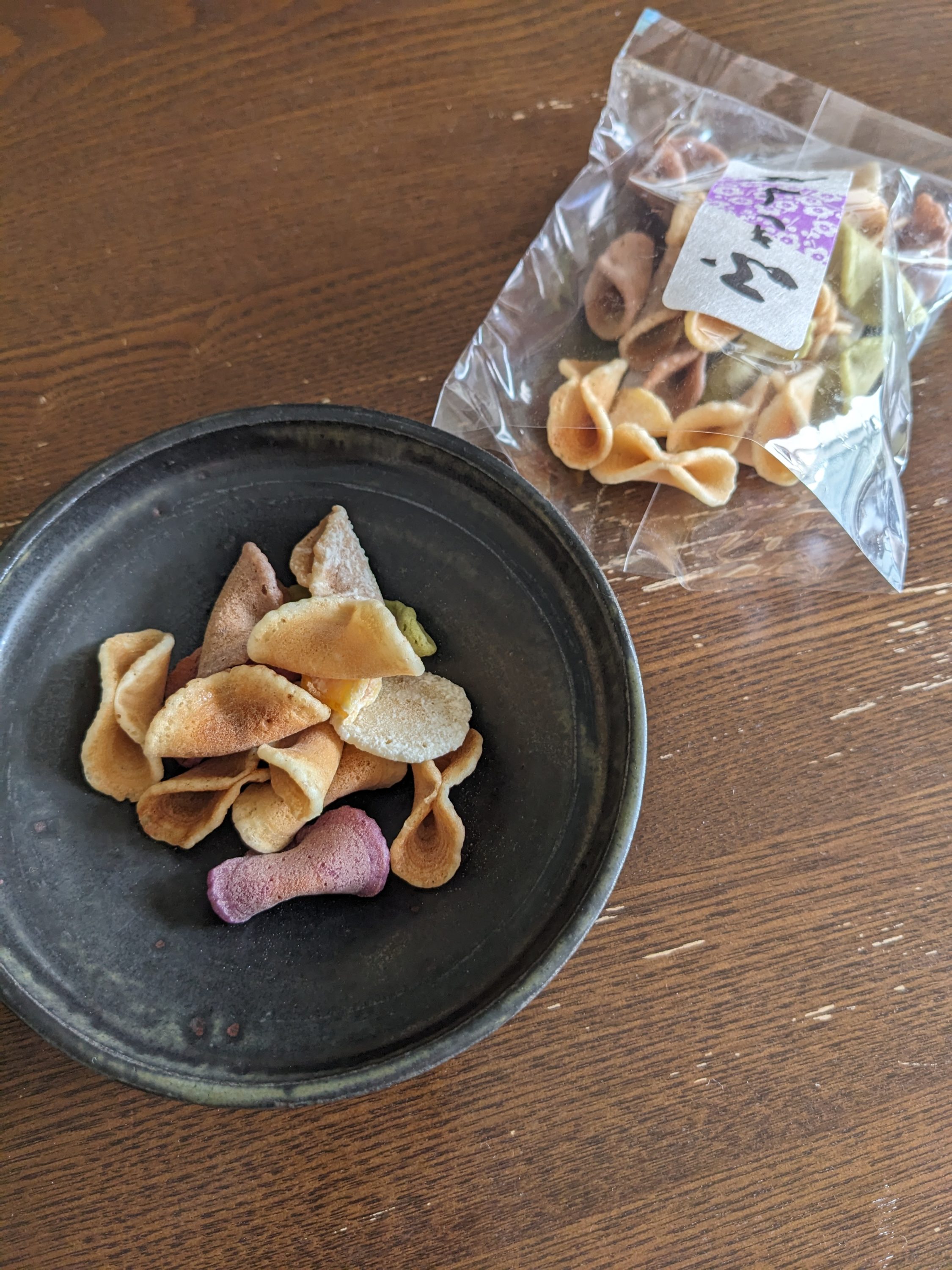 15時頃、小腹も減ったし、仕事も飽きたしで、手近なおやつをあける。こんぴら歌舞伎のお土産で貰った「ふきよせ」。何の気なしにつまんだけど、なんか妙に美味しい。今西製菓という観音寺のおせんべい屋さんのもの。