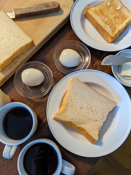夫が注意深く3枚残しておいた食パンで朝ご飯。私は焼かずに1枚、夫は焼かずに1枚、焼いてバターシュガーで1枚。ゆで玉子とコーヒー。