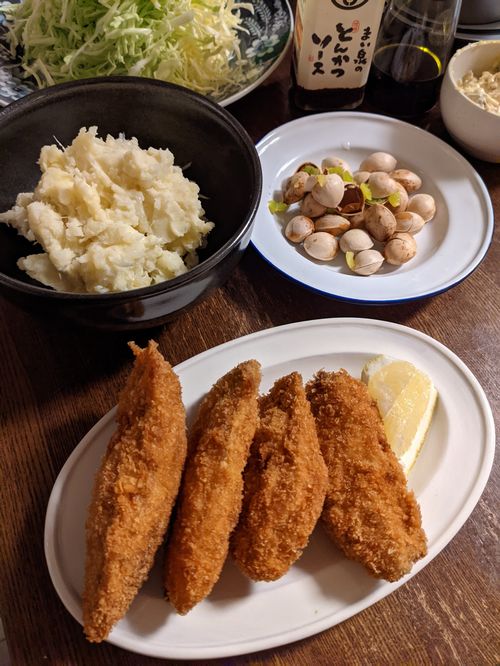 昨日かきチャウダーに使った冷凍かきを4個取り分けておいて、ピチットに包んで置いておいたので、フライにする。十分おいしい、なんか、ちょっといい惣菜屋で売っているフライって感じだった。