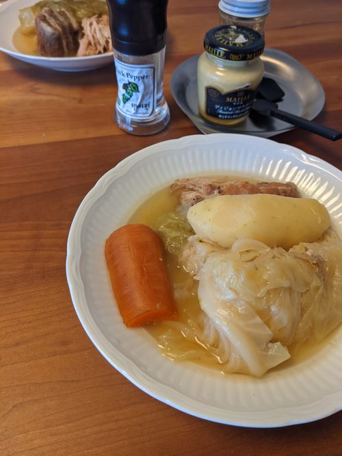 何回も作っていると、やっぱり、じゃがいもとキャベツと肉の3種類で作るのがしみじみ食べれていいなと思うのだけど、こういう煮込みに大きいにんじんが入っているのは好きなので、にんじんだけはいてもいいかな…と思っている。