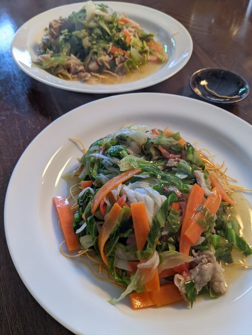 今日の具はほんとのほんとに残り野菜。キャベツの外葉を刻んでゆっくり炒めてやわらかくしたのに、にんじん、ねぎ、豚肉。