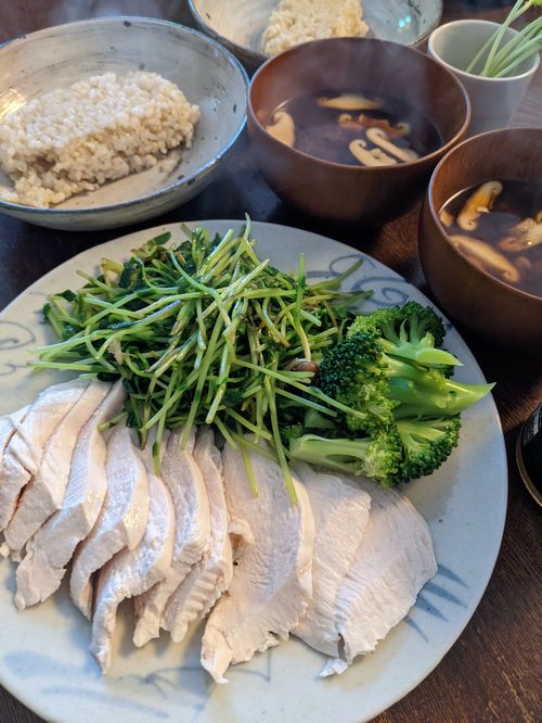 昨日のゆで鶏の残り半分を切って出し、豆苗の塩炒め、ゆでブロッコリー。生しいたけ入り赤だし、玄米ご飯。