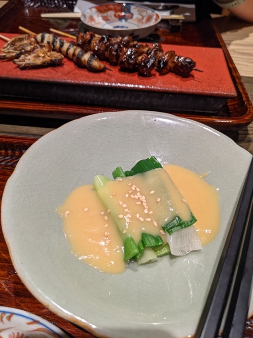 くりからというのは、切れっ端を串に刺して焼いたもので、本来は気楽な食べ物だったようですが、お店によってはきれいに捌いた身をくるくる巻いてちゃんとした一品料理にしているところもあって、ここのはそっちみたいでした。たれと塩と梅が選べましたが、塩で頼んでみたら、脂がガッツリ落ちて、カリカリふんわりな上品なお味でした。備え付けの山椒ペーストがとてもよく合う。