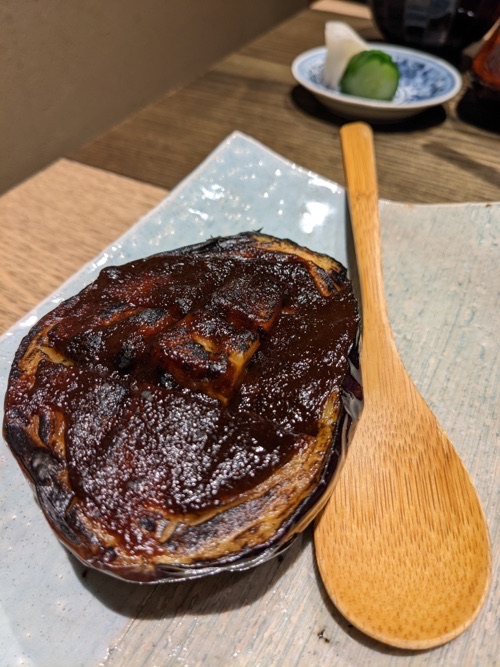 お酒のお代わりして(天狗舞山廃純米吟醸)、茄子田楽。確か、鰻茄子田楽を頼んだつもりだったが、鰻はどこか…と突き回しつつ食べたけど、多分、茄子田楽だと思います。これはこれで美味しかったので、もういい。刈穂よりも天狗舞の方が好きな味だったので、今度は天狗舞を最初に2合頼んじゃってもいいかな、と思いました。