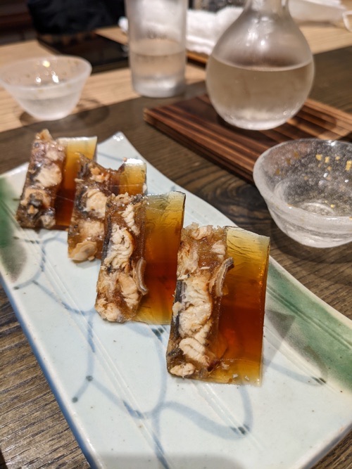 まずは煮凝り。鰻やさんに限らず、メニューに煮凝りがあると、とにかく頼んじゃう。お酒は、刈穂の山廃純米吟醸。