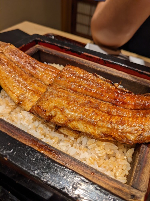 隣のテーブルの会話がほぼ筒抜けな半個室に通されて(そういうの嫌じゃないです)、板さんっぽい感じの人が、今日の鰻ですって、木箱に入った生きている鰻を見せにきた。なんかそういうプレゼンテーションって、銀座っぽいなと思ってしまった。