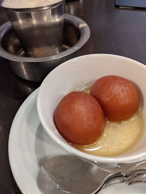 食後に、マドラスコーヒーとグラブジャムン。どんなのがくるのかなーと思っていたら、シロップに浸ったベビーカステラみたいなのが出てきました。このシロップが激烈に甘くてびっくりしたんですが、後から検索してみたら「世界一甘いお菓子」と言われているお菓子だそうで、甘いお菓子揃いのインド菓子の中でも最強クラスなものだったそうです。