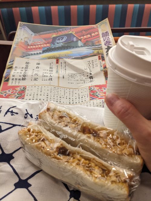駅構内にあるサンエトワールのイートインで朝ごはん。たまごロールとチョコクロワッサン、夫はあんパン。時刻は9時近かったが、意外とサラリーマンが多く、特に近隣にビジネス街があるわけではないようなのにと、少し不思議な感じがした。