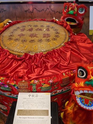 今日は十五夜なんですけど、中華圏の人にとっては中秋節であって、ロビーには巨大な月餅が、お獅子と一緒に飾られていました。説明書きには1994年から毎年作っていて、直径1m、黒あん42㎏、皮の生地10㎏、アヒルの塩卵8㎏(700個)だそうです。なんか大きすぎて、最初食べ物に見えなかったけど、これ、やっぱり、最後はみんなで食べるんですよね、きっと。
