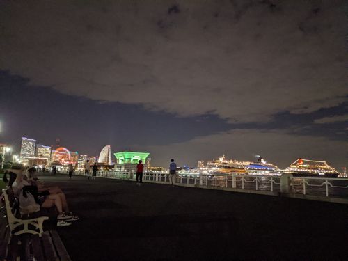 食後に山下公園まで行って、お月見。同じことを考えている人が多いのか、たまたまそういう時間帯だっただけなのか分からないけど、ベンチは空を見るカップルがずらりと座り、そぞろ歩きする人も多かった。21時を過ぎたら急に人気がなくなったので、天気のいい日は毎日こんな感じなのかも。