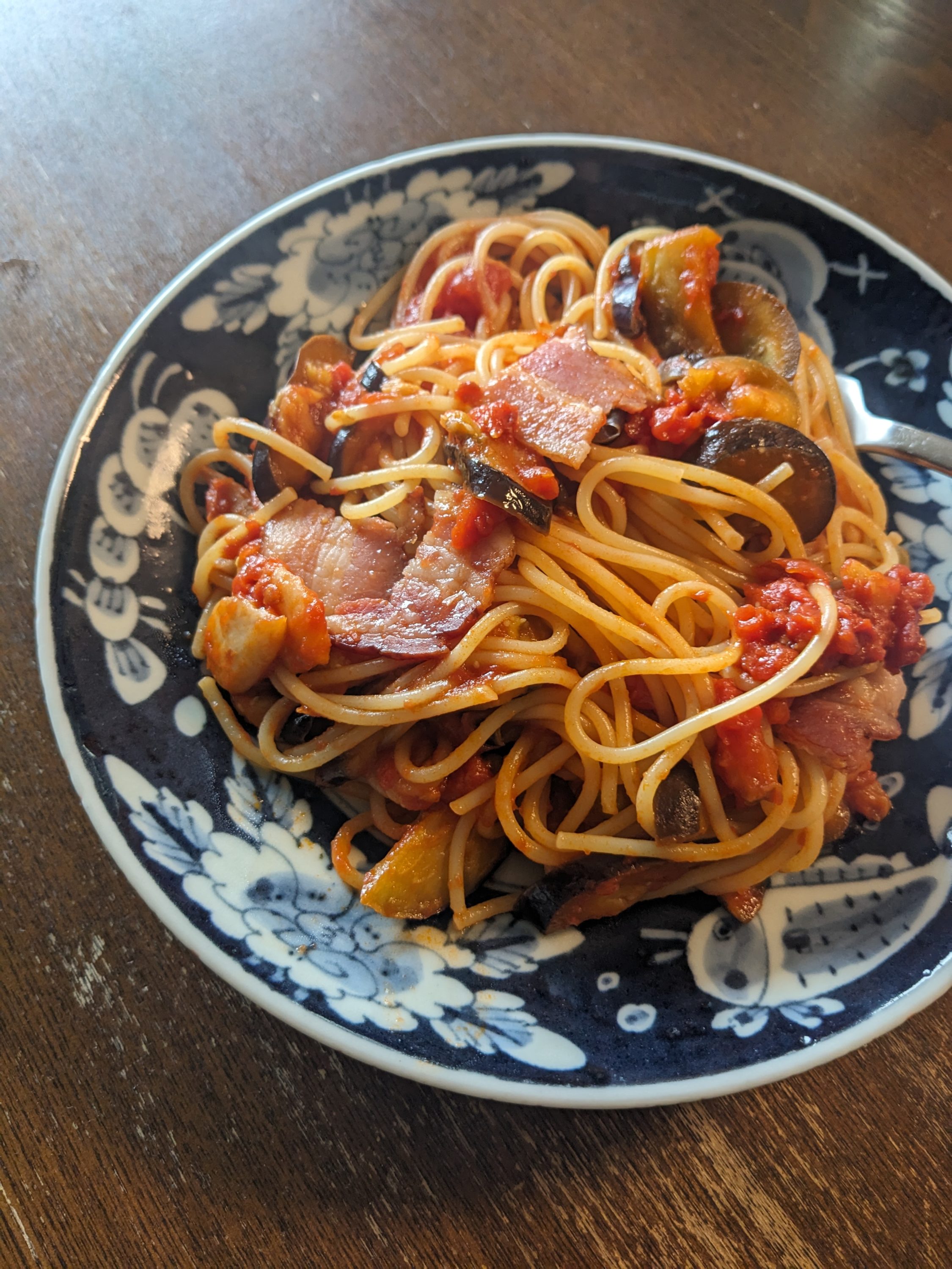 しなびたなすと、冷凍庫のベーコン、買い置きのトマト缶でなすベーコンパスタ。パスタは60グラムでいいのだけど、中途半端に残るのがイヤで80グラム茹でたら、やっぱり多かった。ひとりだと、量の塩梅が難しい。