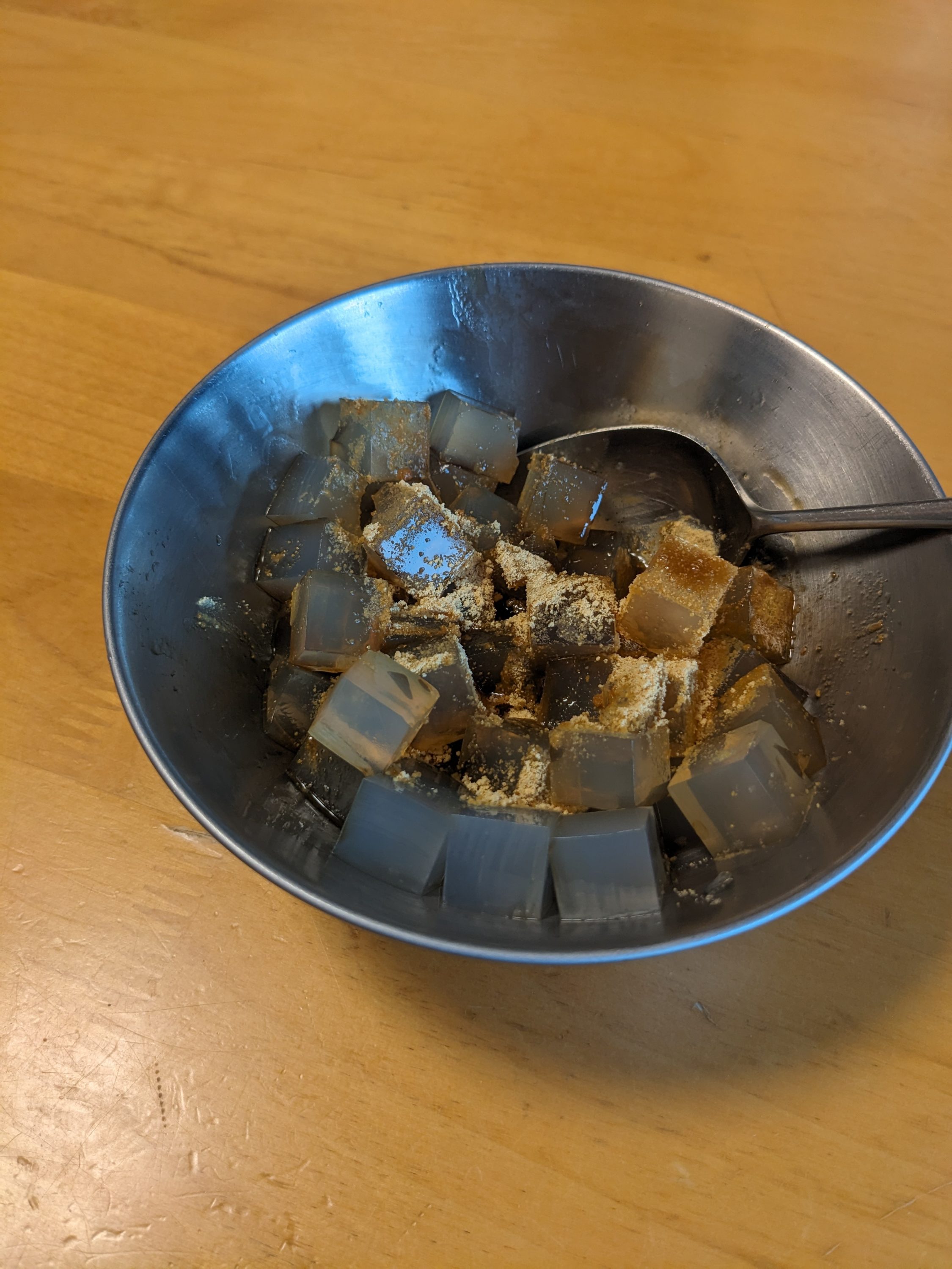 帰宅して、気絶するように寝落ちして(不思議と眠たかった)夕方起きた後、作っていた寒天に黒蜜ときなこをかけて食べてみる。くず餅を食べると黒蜜ときなこがついてくるが、もれなく少しずつ残ってしまって、なんとかせねばと思っていたのだった。
