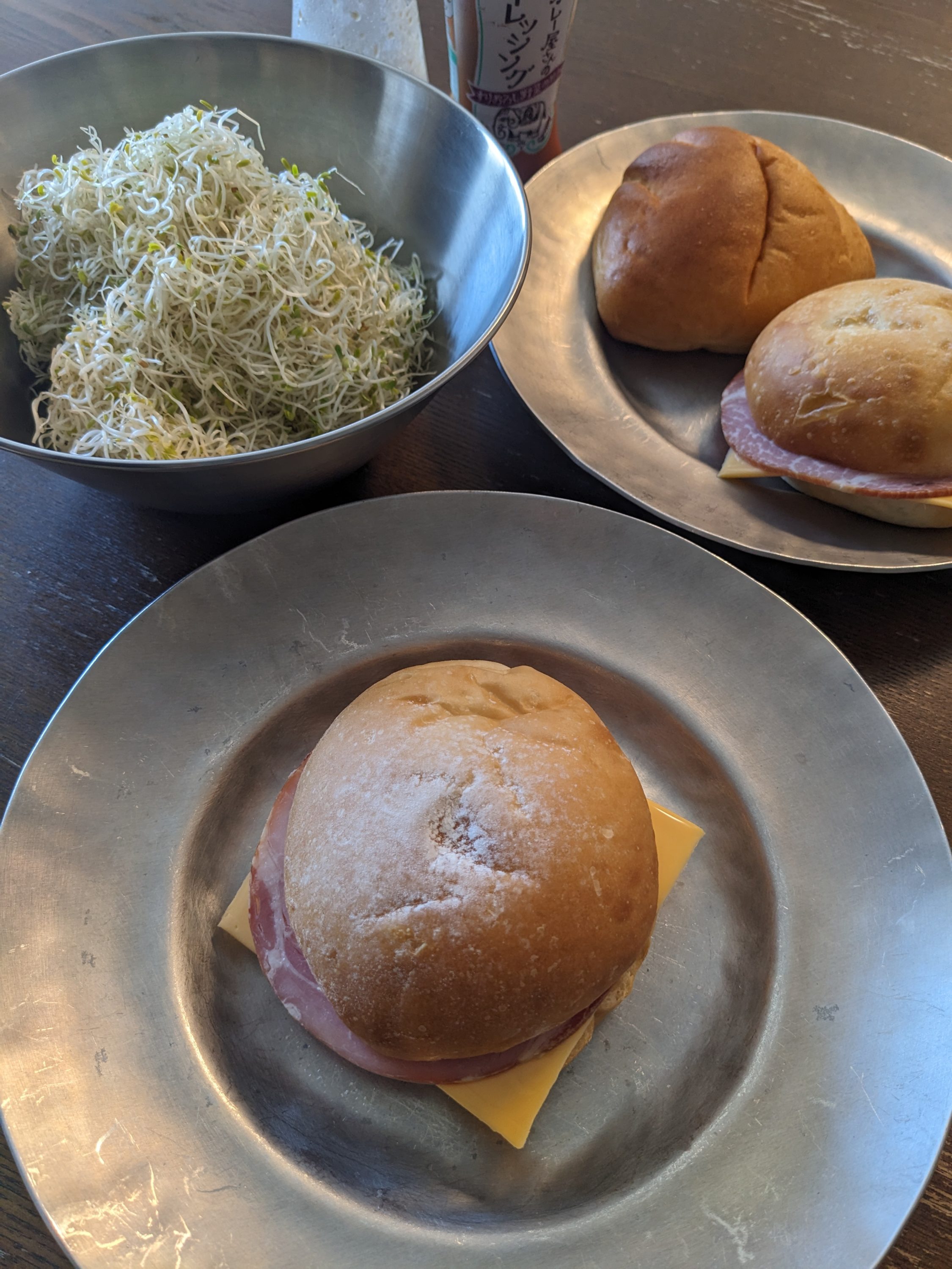 王様のロールパンにハムとチーズを挟んだサンドイッチ。昼過ぎに出る夫用に、朝にあらかじめ2個作って置いておいて、私の分も作っていたので、座って食べるだけ。らくちん。って、ただ単に、先に自分で作っていただけなんだけど、なんとなく得した気分はある。