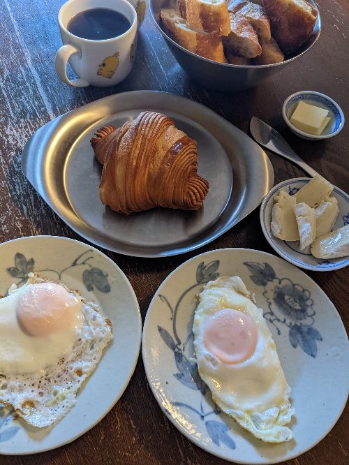 ビゴの店の生バゲットと、ゴントランシェリエのクロワッサンで晩ご飯。ゴントランシェリエはお久しぶりで、クロワッサンはこんな味だったかなぁと思い返しながら食べた。意外にしっとりもっちり系でほんのり甘い生地だった。そのままよりも、サンドイッチで食べるのが似合いそう。