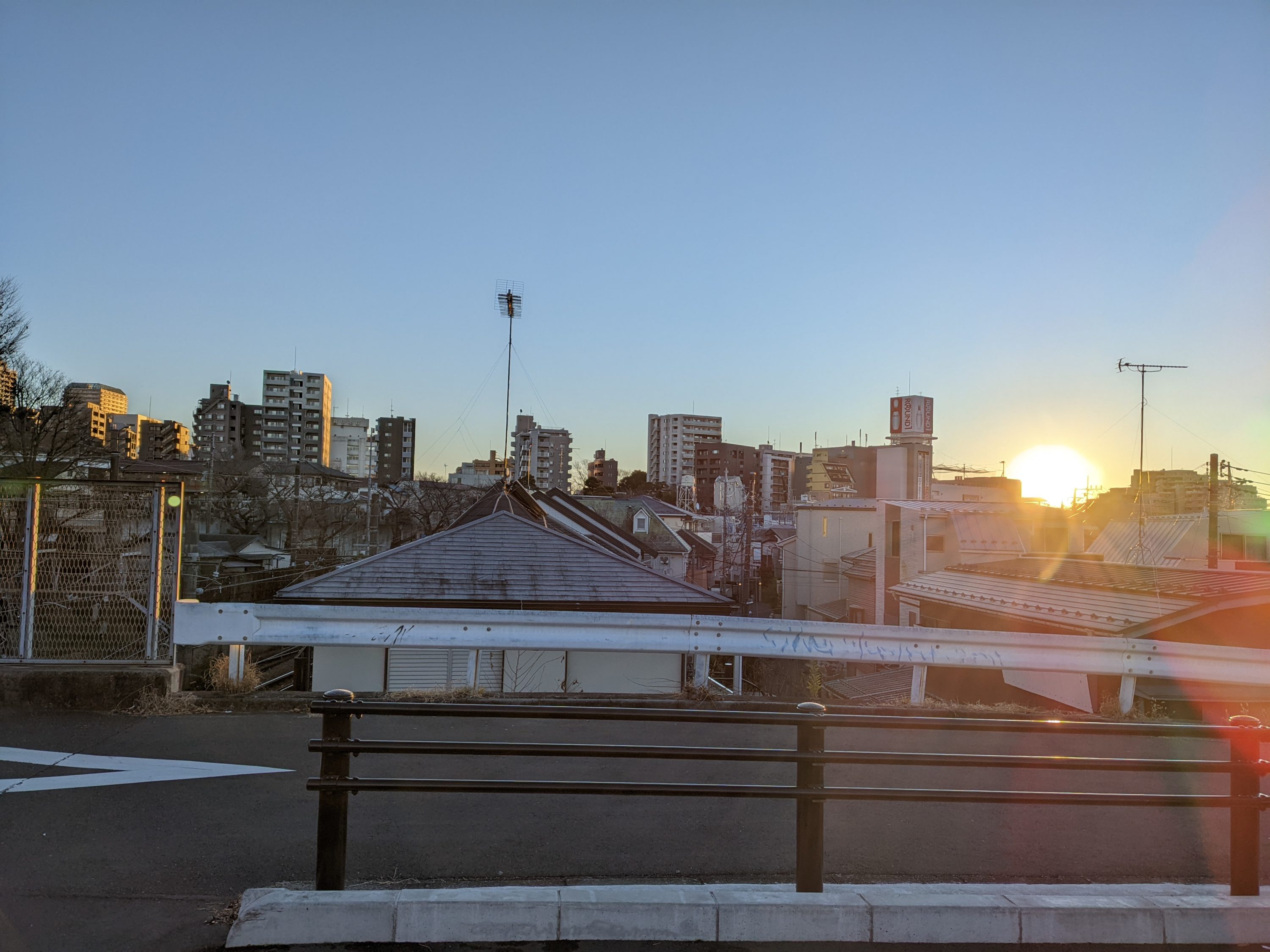 元旦だから、いつもの散歩の帰りにちょっと回り道をして、日の出が見えそうな高台にって、朝日を拝む。幸いいい天気で、よい日の出だった。