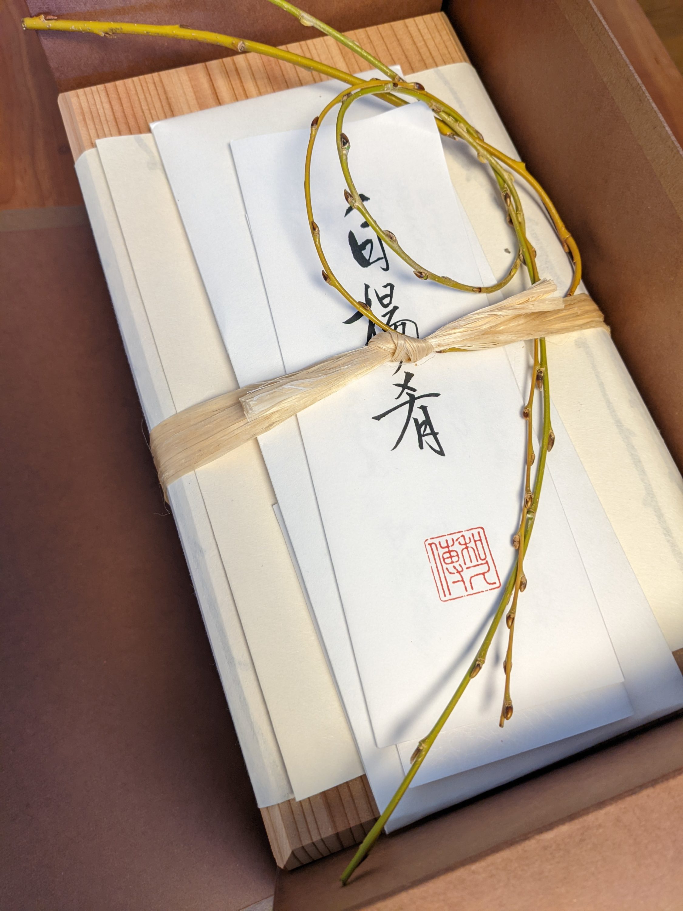 帰宅して、昨日の夕方に届いたおせちの段ボールを開封する。段ボール、外箱の順に開封して、木箱を取り出す。木箱には結び柳が添えられているのが、料亭っぽいなぁと思う。