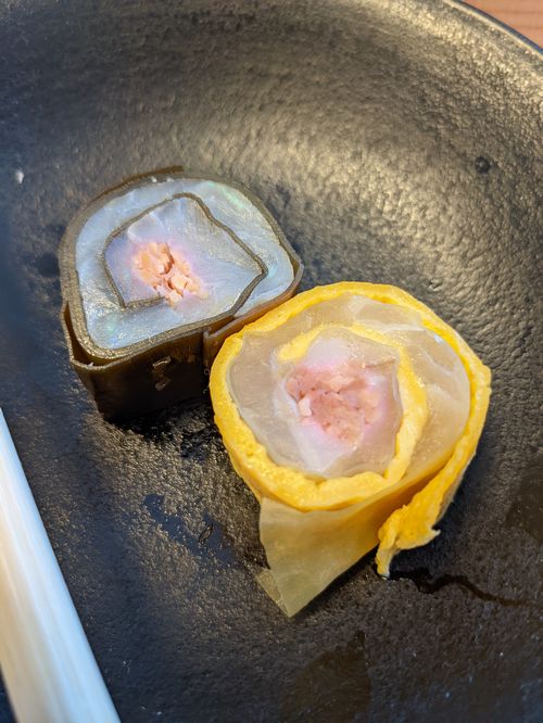 私は関東育ちなのに龍飛巻きはとても好きでして、たっぷり入っているのはとても嬉しい。手前の、甘鯛昆布締めを玉子で巻いたのももちろんおいしい。