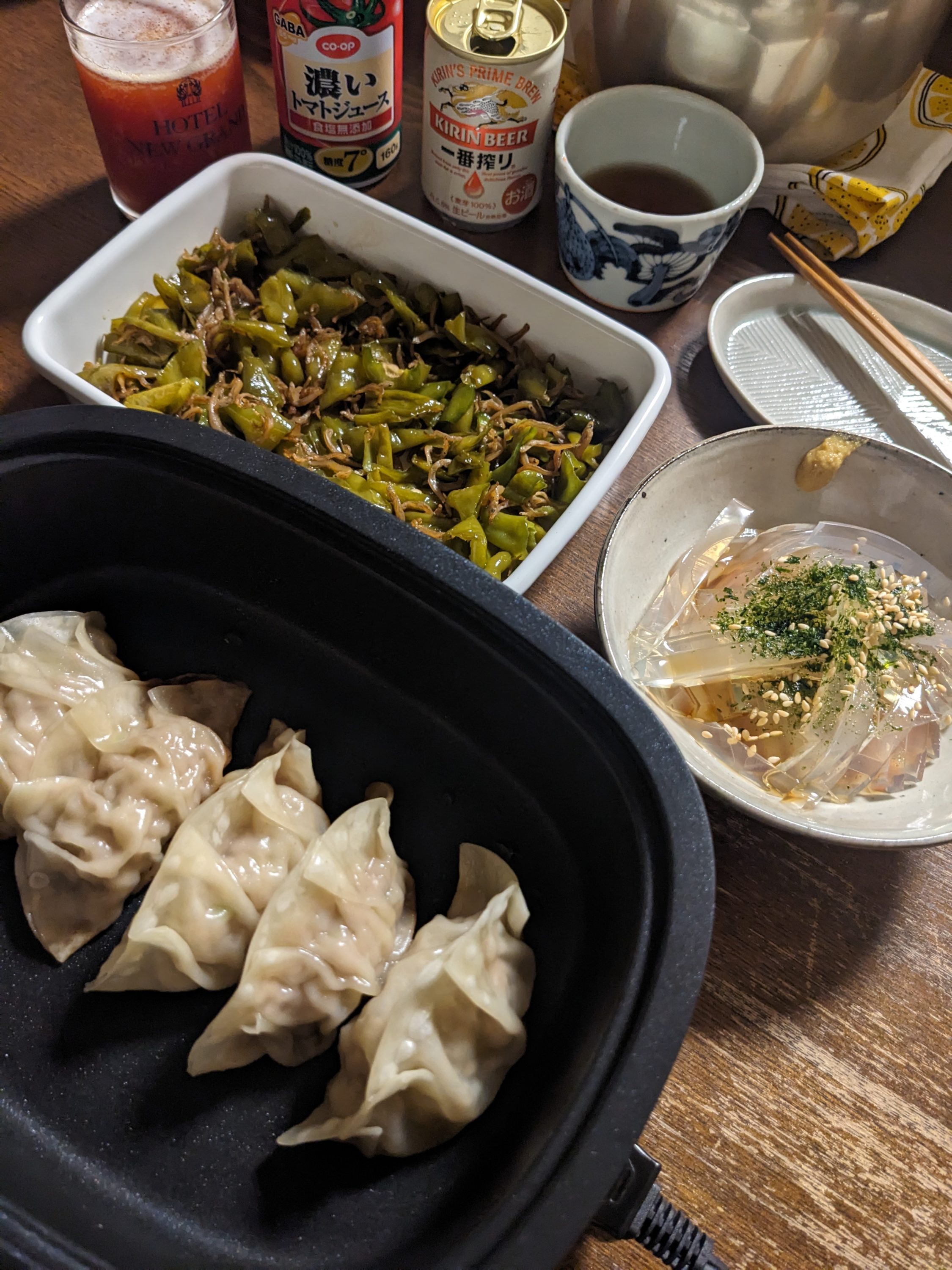 ひとりなので、作り方は雑。キャベツは包丁で刻んで塩をしておく。しょうがをみじん切りにしておく。ひき肉(普段は小間肉やバラ薄切り肉を手で刻んで使うが、ひとりだとそんなことはしない)に酒、醤油を入れて下味を付け、絞ったキャベツと刻んだしょうがを入れて混ぜる。あとは、包んで焼くだけ。ホットプレートにお任せしてみたが、十分だった。便利だなー。