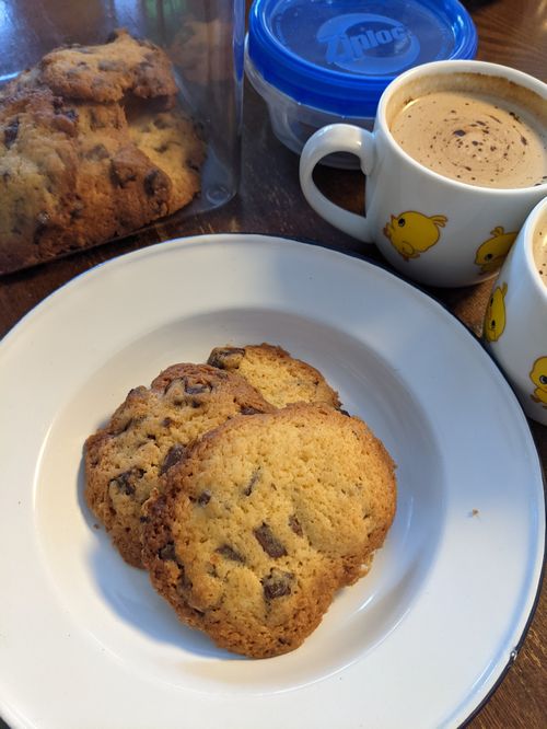 昨晩不意に思い立ってチョコチップクッキーを作ったのだけど、ついうっかり、材料をひとつ入れ忘れてしまい(オートミール)、気づいたときにはどうしようもないのでそのまま焼いたところ、やっぱりなんだか違う…と言う仕上がり。